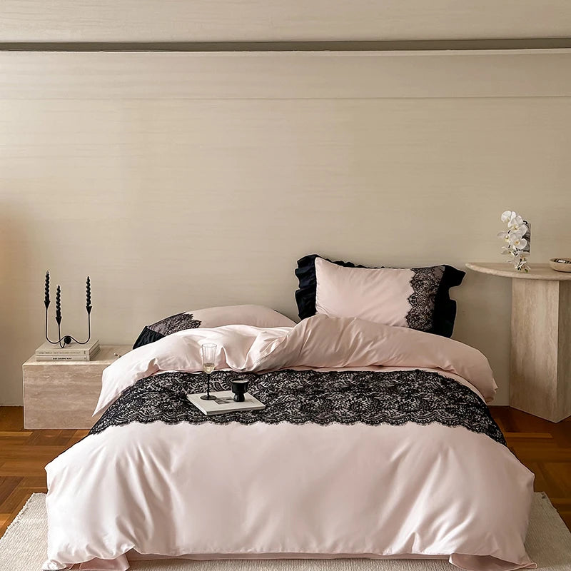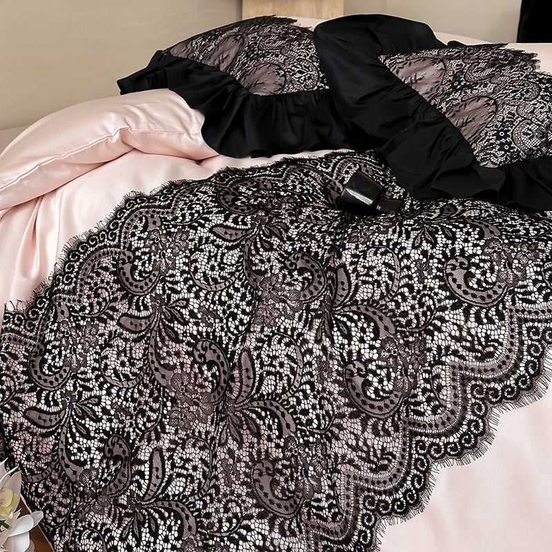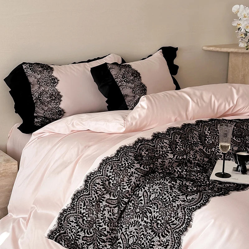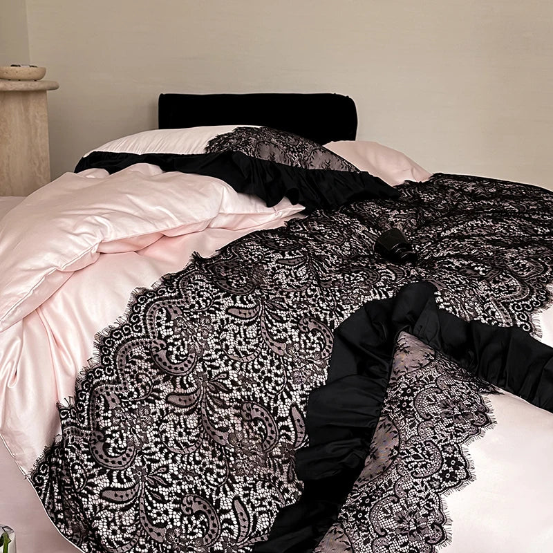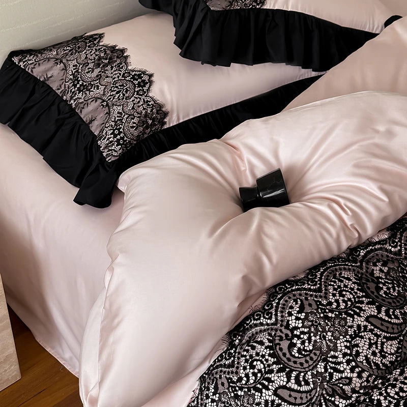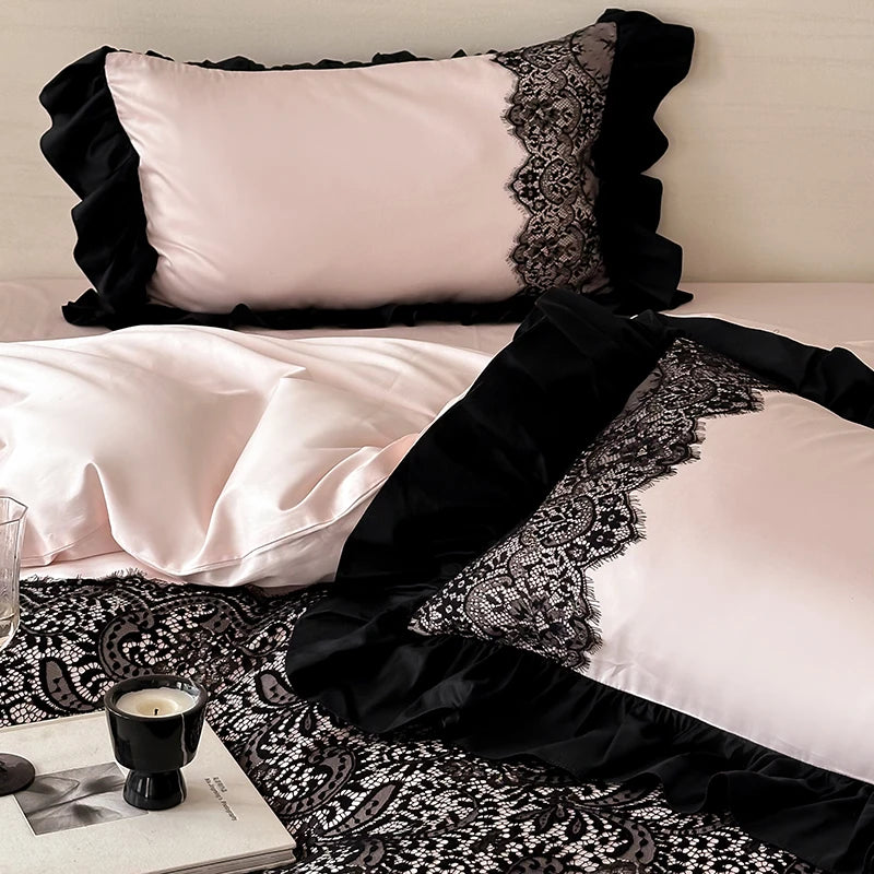 The Lola Vixen Romantic Duvet Set – Forbidden Rose is soft pink sweetness with a black kitty scratch. Think blush petals, midnight ruffles, and a vibe that makes your room feel like a secret diary come to life.